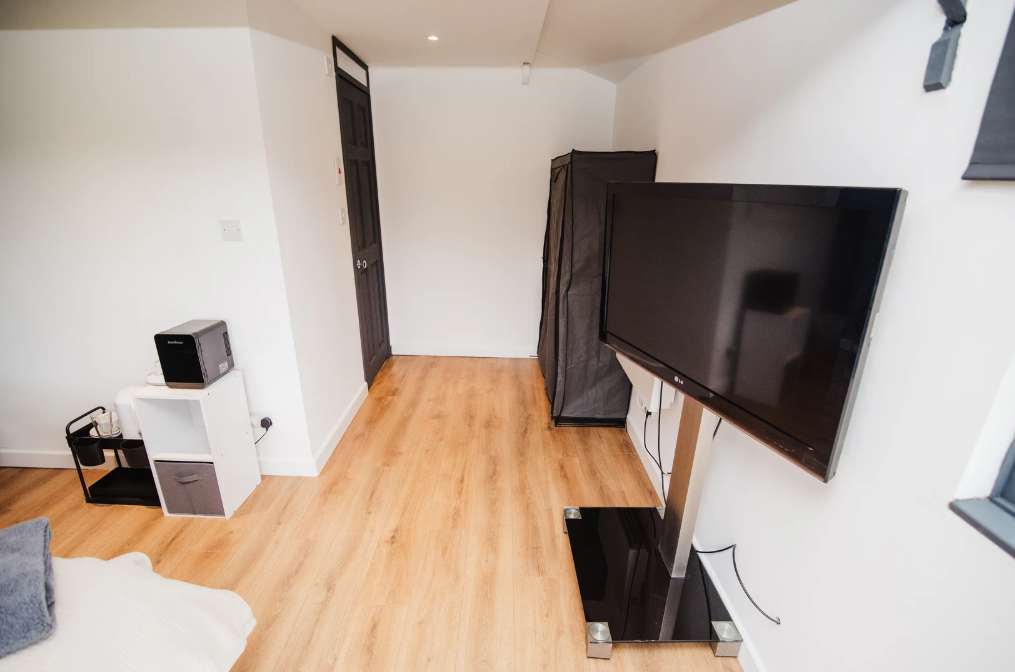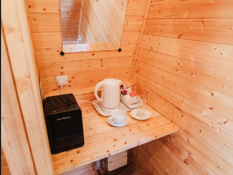 Inside, the pod centres around a comfortable double bed, creating a snug yet contemporary sleeping area. The space is thoughtfully equipped with everything needed for a short stay, including a mini fridge, tea and coffee facilities, and a flat-screen TV, so guests can unwind with ease.