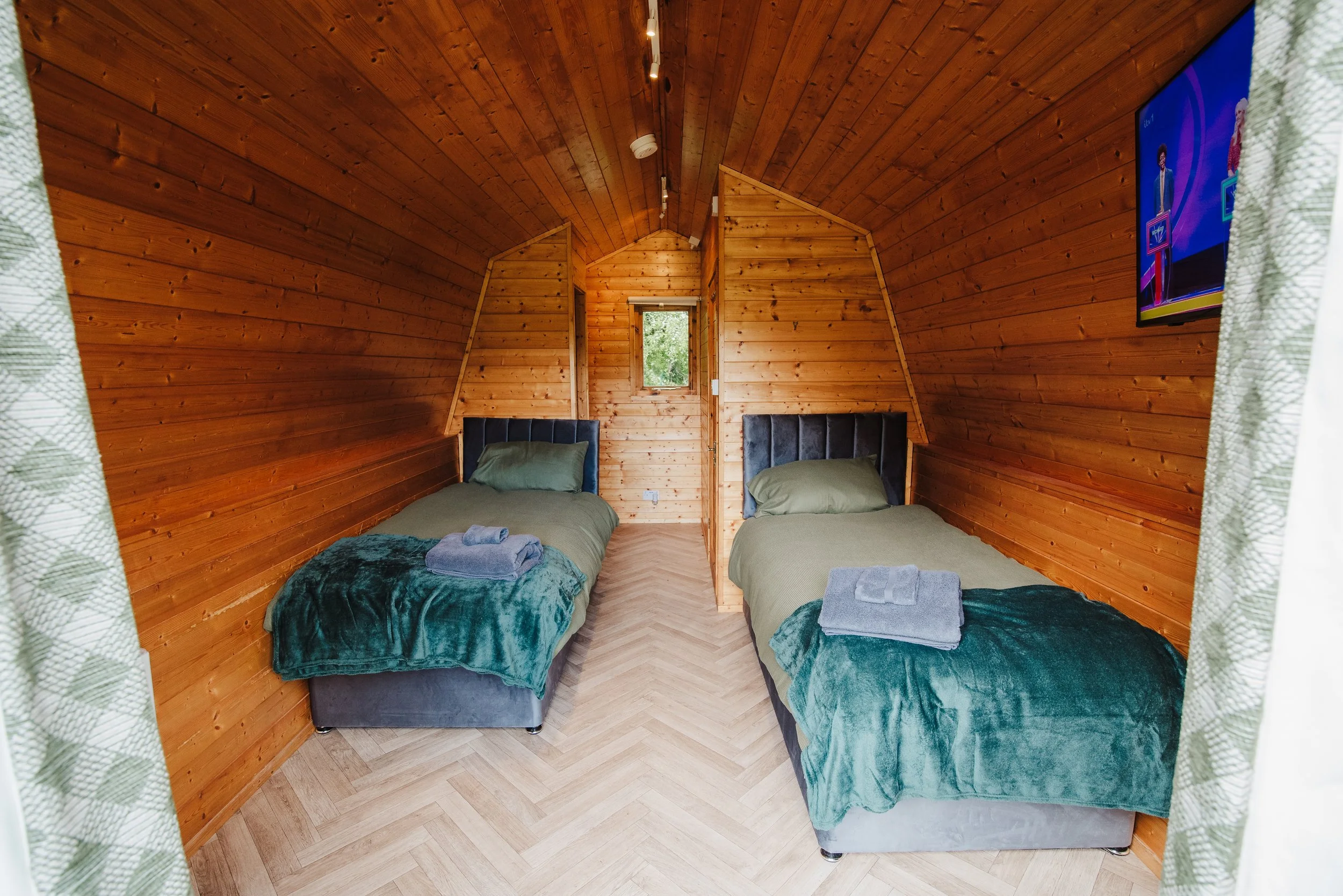 Inside, the pod features two comfortable single beds, providing a relaxed and flexible sleeping arrangement while maintaining a warm, modern feel. The space is thoughtfully designed to make the most of its compact layout, giving guests everything they need for a convenient and enjoyable stay.